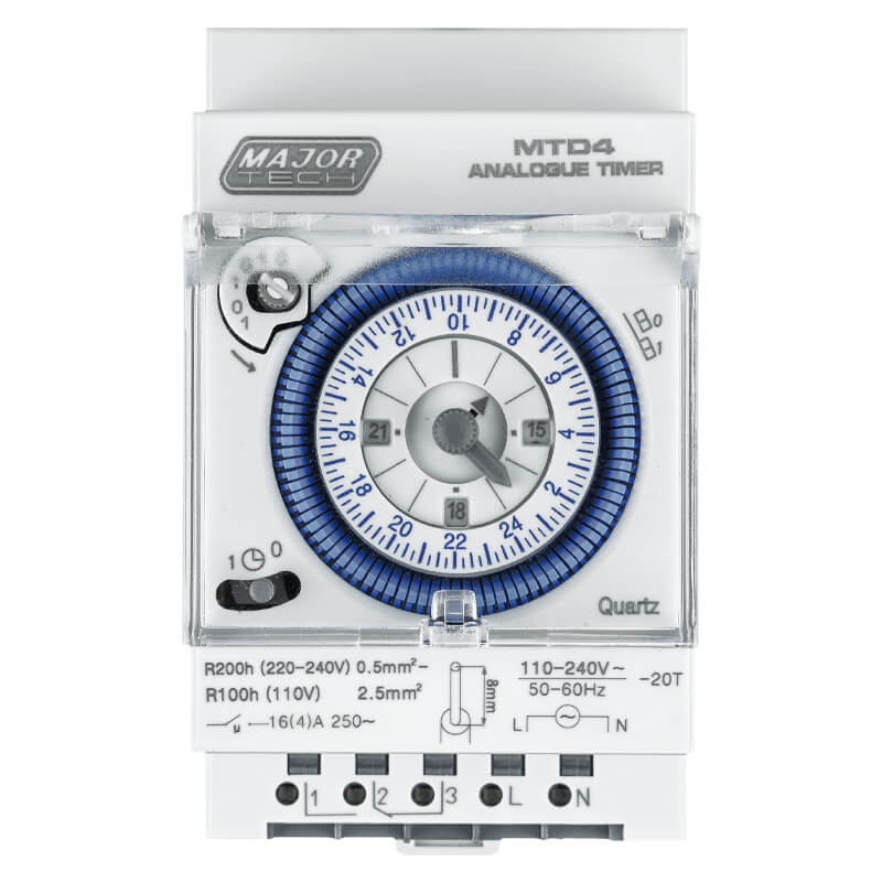 The MTD2 24 Hour Analogue Timer is a reliable and easy-to-use DIN rail mountable 16A time switch, ideal for automating electrical systems such as geysers, lighting, pool pumps, and other appliances. With 24-hour programmable switching, it allows precise control of electrical loads up to 16A, offering improved energy efficiency and operational convenience. The timer features 96 adjustable pins for daily settings, providing a minimum switching time of 15 minutes per pin. It includes a manual override function for flexible operation and an integrated 100-hour battery backup to maintain functionality during power outages. Designed for durability and performance, the MTD2 operates with a very efficient standby consumption of 0.5W, with a robust load rating of up to 2300W (Resistive load) and a constant 920W (Inductive load for Motors), and is built to meet stringent safety and installation standards.