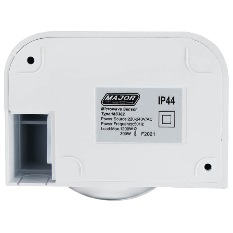 The MS362 automatically turns on lights or any electrical device within the sensors rated load. It detects through obstacles like doors, glass panels, and thin walls, with a 360° detection range when mounted on a ceiling and 180° when wall mounted, and adjustable settings for time, Lux level and sensitivity. Easily integrated into new or existing installations, it excels in detecting subtle movements over large areas compared to PIR sensors.With an IP54 rating, the sensor is suitable for both indoor and sheltered outdoor installations, offering protection against limited dust ingress and water splashes from any direction. Installation must be done by a qualified electrician.