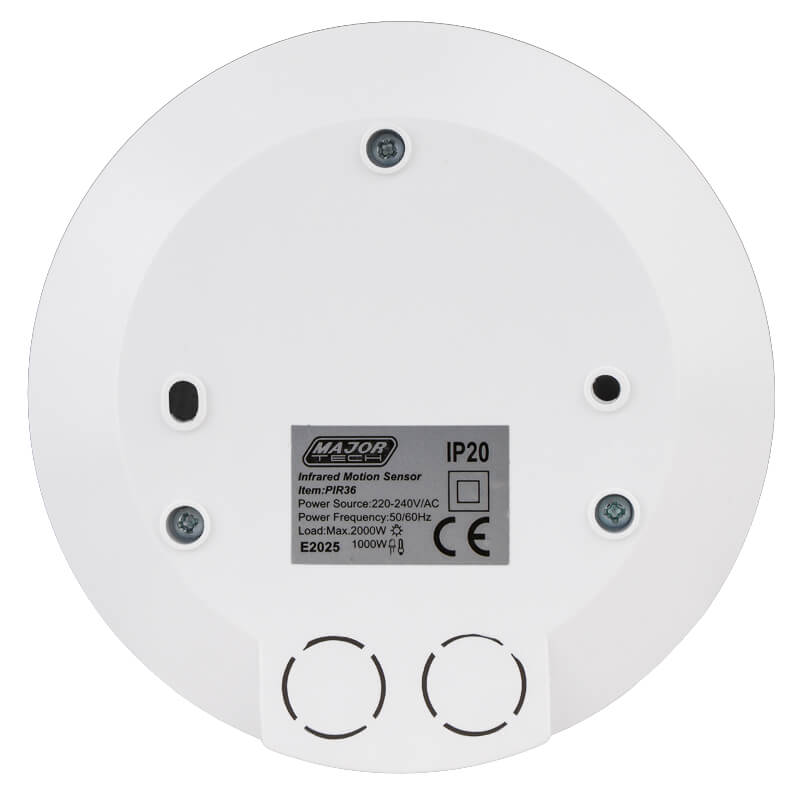 The PIR36 automatically turns on lights or any electrical device within the sensors rated load, when motion and body heat is detected. It has a 360° detection range and adjustable settings, easily integrated into new or existing installations. With an IP20 rating, the sensor is intended for indoor installations. Installation must be done by a qualified electrician.
