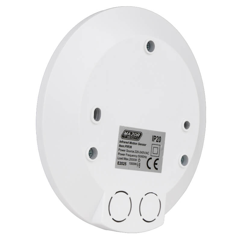 The PIR36 automatically turns on lights or any electrical device within the sensors rated load, when motion and body heat is detected. It has a 360° detection range and adjustable settings, easily integrated into new or existing installations. With an IP20 rating, the sensor is intended for indoor installations. Installation must be done by a qualified electrician.