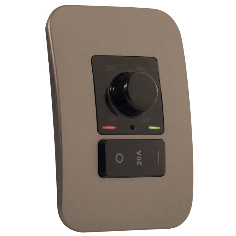 The rotary thermostat is rated at 3000W and can be used for most heating applications where a maximum temperature of 40C is appropriate. The thermostat includes 2 indication light lenses whereby the one shines orange when the power is on and the 2nd has 2 lights behind it, one to show heating (red) and the other to show the desired temperature has been reached (green). The thermostat can be used for both air control installations and capillary sensor installations which is controlled via a dip switch positioned on the PCB. The default factory setting is set for air sensor control and to change to capillary control the switch must be brought forward. Accessories: Fixing Frames Cover Plates