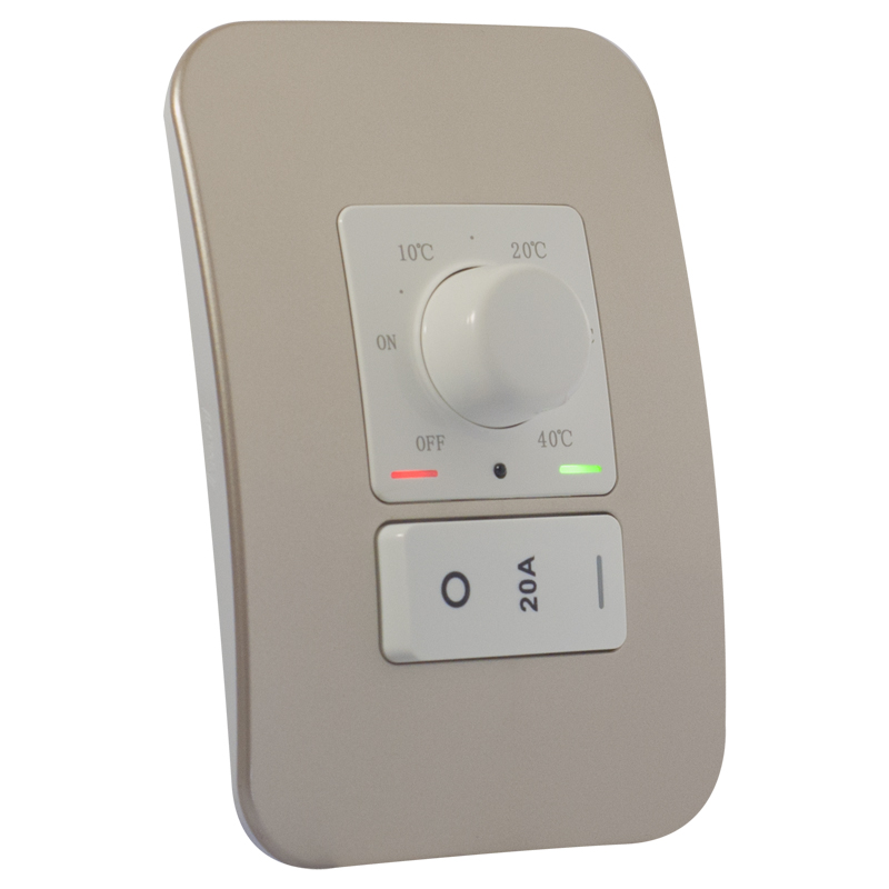The rotary thermostat is rated at 3000W and can be used for most heating applications where a maximum temperature of 40C is appropriate. The thermostat includes 2 indication light lenses whereby the one shines orange when the power is on and the 2nd has 2 lights behind it, one to show heating (red) and the other to show the desired temperature has been reached (green). The thermostat can be used for both air control installations and capillary sensor installations which is controlled via a dip switch positioned on the PCB. The default factory setting is set for air sensor control and to change to capillary control the switch must be brought forward. Accessories: Fixing Frames Cover Plates