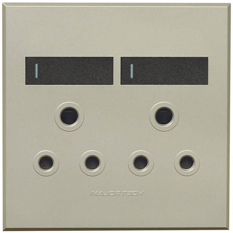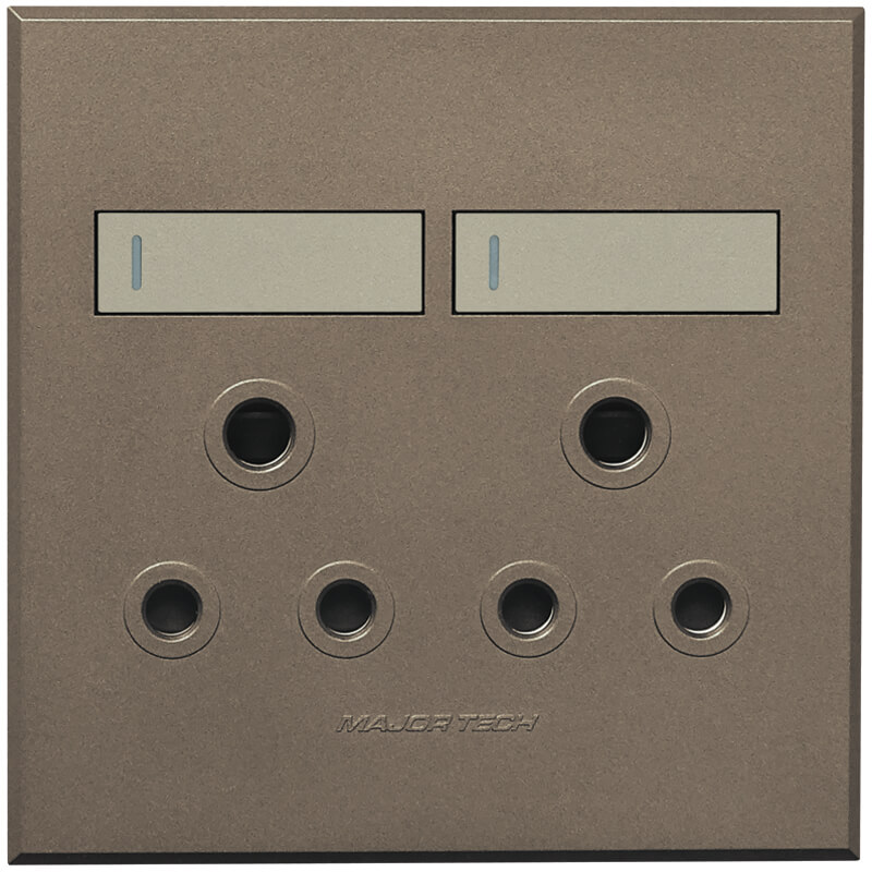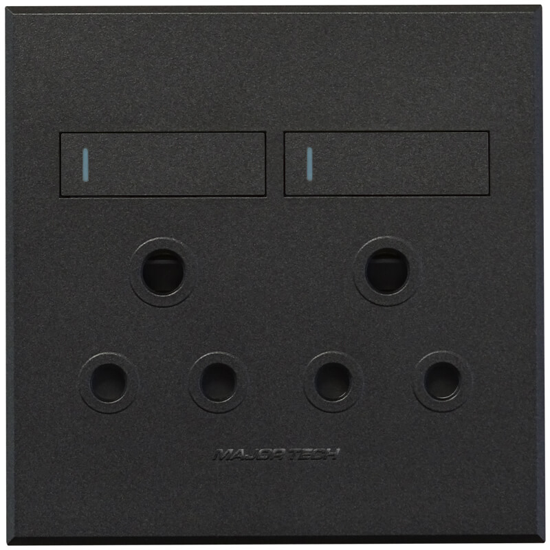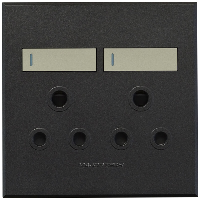 Veti 3’s Double RSA Sockets fits all 100mm x 100mm wall or mounting boxes. The ultra slim design of the VETI 3 range has a modern and stylish look, sporting large switch covers for easy switching. The switches have a toggle action with the unique feature of being flat in the Off position, and slightly ajar when in the On position. The VETI 3 cover plates and switch covers have an array of four interchangeable matt colour finishes to suit any interior. As standard options, Major Tech supplies five colour combinations to simplify the selection process. These combinations are a bronze cover with titanium switch, a titanium cover with graphite switch, a graphite cover with titanium switch, a graphite cover with graphite switch and a white cover with white switch. Due to the safe customisation process unique to the VETI 3 range, customers can decide on any colour combination to ensure a stylish finish to match their décor. In addition, a combination of two-way and Bell Press switches are available as a standard selection. Each switch includes a luminous fluorescent strip which glows when charged by sunlight or the lighting in the room. These strips do not consume current, however, and the glow will therefore only be visible in areas where they are exposed to sufficient light that is able to charge the fluorescent strip. The same winning combinations The VETI 3 series is a new monoblock design with a range of socket outlets available in both 100 x 100mm and 100 x 50mm versions. Moreover, VETI’s popular patented socket with the two V-Slim 16A sockets (SANS164-2), the new SA 3-pin standard, and two standard 16A round pin sockets (SANS164-1) have also been made available in VETI 3, offering more versatile functionality. Major Tech has also catered for communications sockets (satellite, data and telephone sockets) in dual socket combination at the same price as a single socket. There is also a switched dual 2.1A USB socket outlet which complies with all relevant local and international standards, combined with V-Slim sockets (SANS 164-2) and SA round pin sockets (SANS164-1). Electricians will also appreciate the simplified bridging options in certain multi-switch products. Instead of having to manually bridge switches, VETI 3 includes an internal bridge which automatically bridges the switches after the electrician has attached a single electrical cable to the input terminal. Not only does this enhance the safety of the installation, but it also makes it simpler and faster for electricians to get the job done.